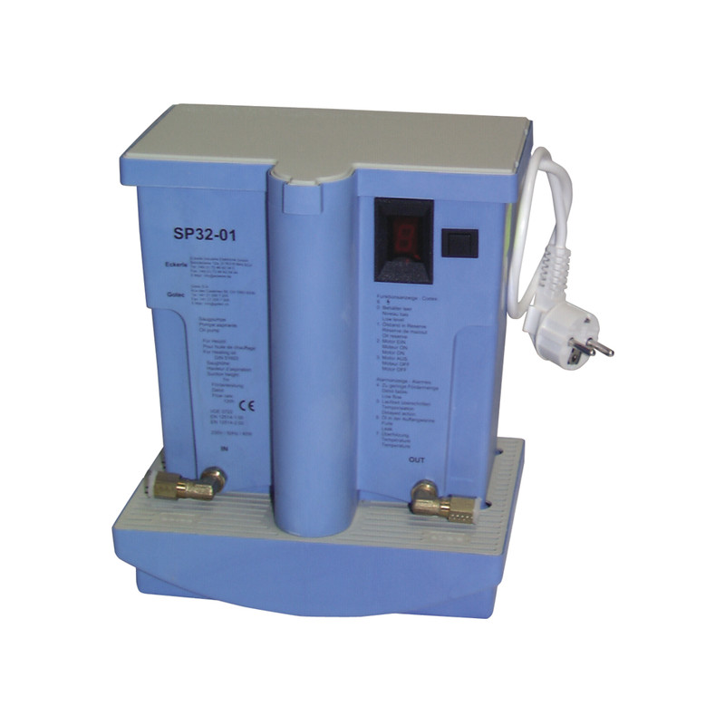 UTILIZZO Aspirare la nafta da una cisterna e alimentare per gravità delle stufe. Questa nuova pompa integra tutti i nuovi standard di sicurezza e di protezione dell'ambiente. A tali vantaggi sono associati una sorveglianza del funzionamento elettronico al 100%, una visualizzazione LCD delle diverse fasi di funzionamento, una qualità di fabbricazione ed una affidabilità senza eguali. Una vaschetta di ritenzione dotata di un allarme è compresa nella pompa. Installazione agevole. Ecologica, questa pompa aspirante è utilizzata per l'alimentazione dei bruciatori a nebulizzazione con potenza inferiore a 80 kw, per caloriferi o per bruciatori a evaporazione. Questo tipo di pompa è utilizzato per l'alimentazione automatica a gasolio domestico di stufe a nafta. La pompa aspira la nafta dalla cisterna sottostante e riempie il proprio serbatoio. Per gravità, il gasolio viene distribuito nella stufa a nafta. Il serbatoio assicura un funzionamento intermittente della pompa. Ne risulta un aumento della durata di vita e una diminuzione del livello sonoro. La capacità del serbatoio è di 1.6 litri. L'accumulatore ha una capienza di 0.4 litre e la riserva di 1.2 litri Questo modello è conforme alle nuove norme di sicurezza. I condotti non sono sotto pressione e in caso di fughe dal condotto di aspirazione, la pompa si disinnesca e non fornisce più gasolio. Dotata anche di una vasca di ritenzione dotata di un galleggiante di sicurezza che mette la pompa in allarme in caso di perdite nella vasca del gasolio o nei raccordi in caso di straripamento. DATI TECNICI : Dimensioni : Altezza 285mm Larghezza 217mm Profondità 168mm Peso : 2 Kg portata : 18 L/h con 4 m di aspirazione e una riserva di 1.6L 12 L/h con 7 m di aspirazione e una riserva di 1.6L Caratteristiche elettriche : Monofase 230V 50Hz, 40W VANTAGGI : Funzionamento discreto con il 100% di sicurezza. Filtro e valvola di non ritorno inclusi nella pompa. Vasca di ritenzione e sicurezza di straripamento con allarme. Protezione del motore in caso di andatura a secco. Blocco della pompa in caso di cisterna vuota. Blocco della pompa in caso di condotto danneggiato. Blocco della pompa in caso di temperatura ambiente elevata. Visualizzazione digitale del ciclo di funzionamento.