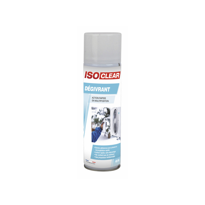 Soluzione liquida a base di alcool e antigelo, lo sbrinante ISOCLEAR sbrina rapidamente scambiatori esterni, vaschette di raccolta, ventilatori, alette dei condensatori, unità split o multisplit... per mantenere il rendimento degli impianti. È applicabile anche su parabrezza di veicoli, serrature, cerniere, cavi e qualsiasi altro meccanismo bloccato dal gelo.
