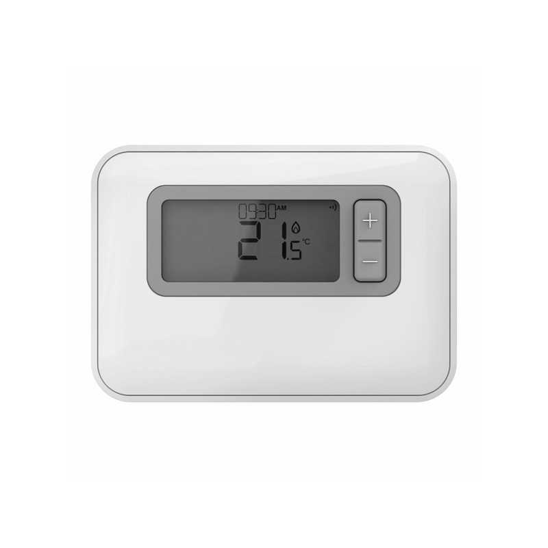 Display retroilluminato Programmazione oraria, settimanale o 5+2 giorni (4 punti di commutazione) Deroga temporale per un periodo di un'ora Modalità vacanza Adeguamento automatico agli orari "estate-inverno Campo di regolazione da 5 a 35°C Ottimizzazione all'avviamento Dimensioni (mm) : H136xL97xP28 Alimentato da 2 batterie AA